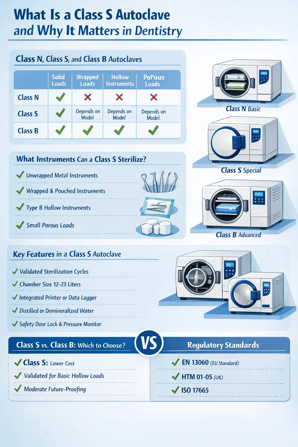 Az S osztályú fogászati autokláv azonban továbbra is ésszerű választás bizonyos esetekben: másodlagos egységként a B osztály mellett a szilárd műszerfordulathoz, olyan gyakorlatokban, ahol a műszertartomány nagyon korlátozott, és nem tartalmazza a kritikus üreges terheléseket, vagy olyan joghatóságokban, ahol az S osztály megfelel az adott feldolgozás alatt álló műszerekre vonatkozó összes vonatkozó szabályozási követelménynek.