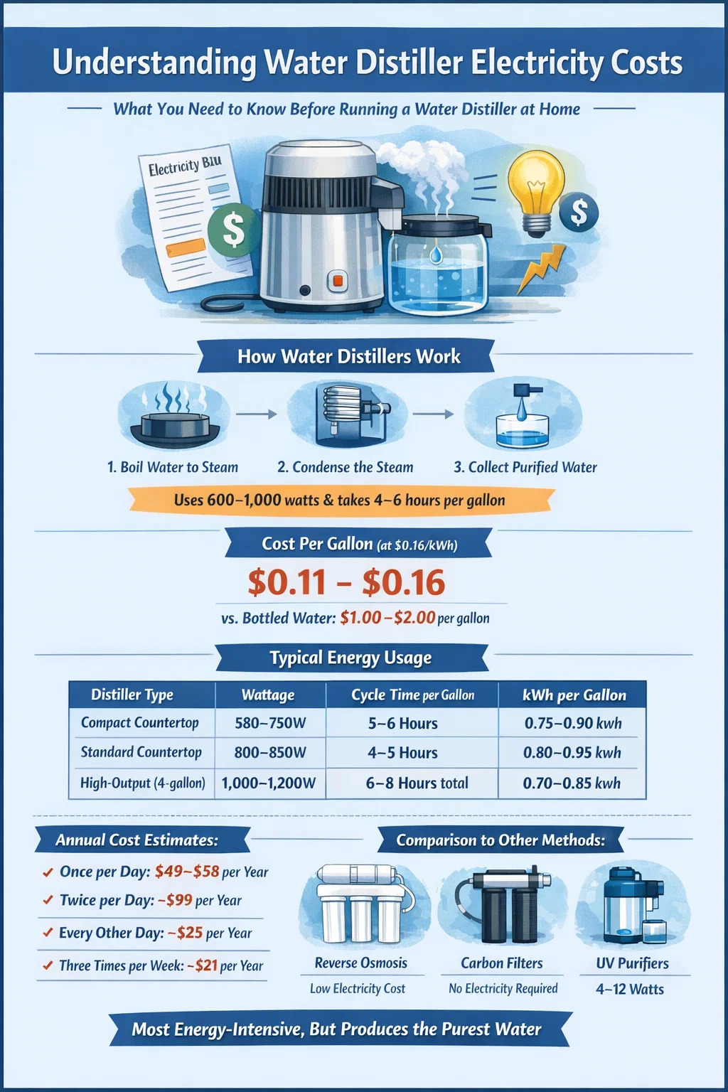 Az otthoni vízlepárló éves villamosenergia-költsége még maximális napi használat mellett is jóval 100 dollár alatt a legtöbb amerikai háztartás számára. A magasabb villamosenergia-díjjal rendelkező államok lakosai – Kaliforniában átlagosan 0,27 dollár/kWh, Hawaii 0,39 dollár/kWh-hoz közelít – lényegesen többet fognak fizetni. Egy kaliforniai háztartás, ahol naponta egyszer üzemel a lepárló, közelebb költene 83 dollár évente csak az adott készülék elektromos áramáról.