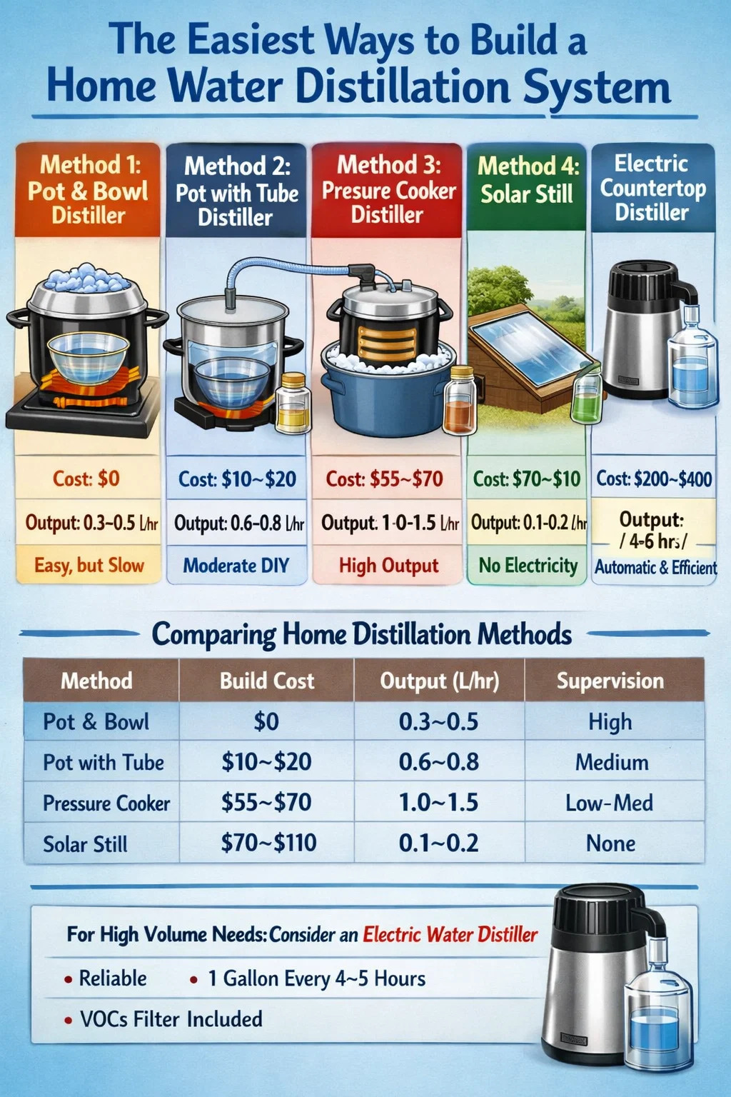 The easiest way to build a home water distillation system is the stovetop pot-and-bowl method — no special tools, no drilling, no hardware store trip required. You place a large stainless steel pot on your stove, float a glass bowl inside it, invert the lid, pack ice on top, and let boiling steam condense on the cold lid and drip into the bowl below. That's the complete working principle of a water distiller, achieved with items you likely already own. For anyone who wants more volume, more convenience, or a permanent setup, there are progressively more involved options — from a simple pot-with-tube rig to a pressure cooker distiller to a solar still in the backyard. This article covers all of them, with the materials, steps, costs, and limitations laid out clearly so you can choose the right build for your situation.