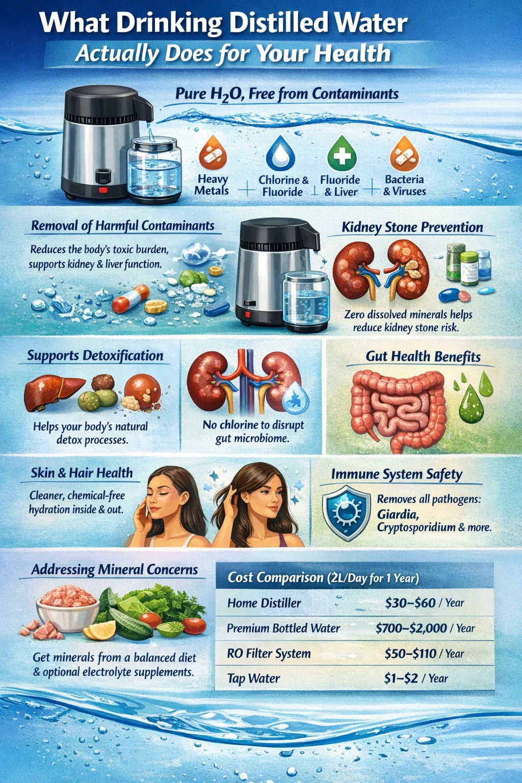 A desztillált víz legközvetlenebb és legjobban dokumentált egészségügyi előnye a szennyeződések szinte teljes hiánya. A desztillációs folyamat eltávolítja: