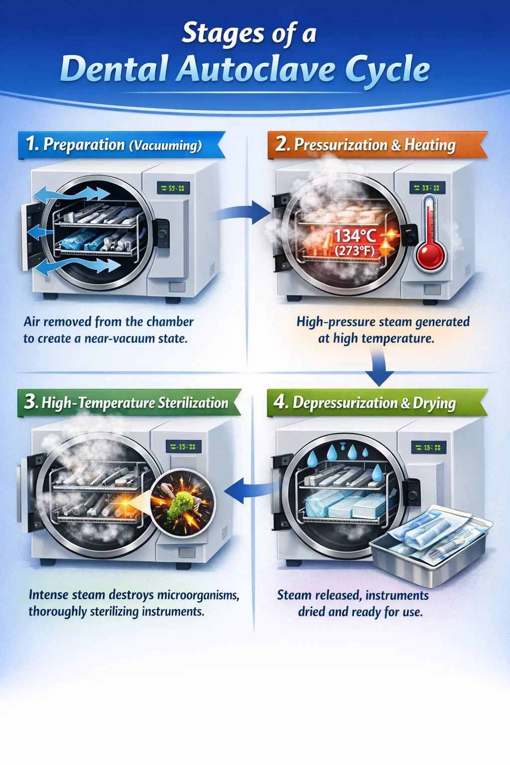 A fogászati autoklávok egyszerűen úgy működnek, mint a háztartási kukta továbbfejlesztett változata. Magas hőmérséklet, nagy nyomás és gőz kombinációját alkalmazzák, hogy alaposan eltávolítsák a mikroszkopikus méretű szennyeződéseket a sebészeti műszerekről.