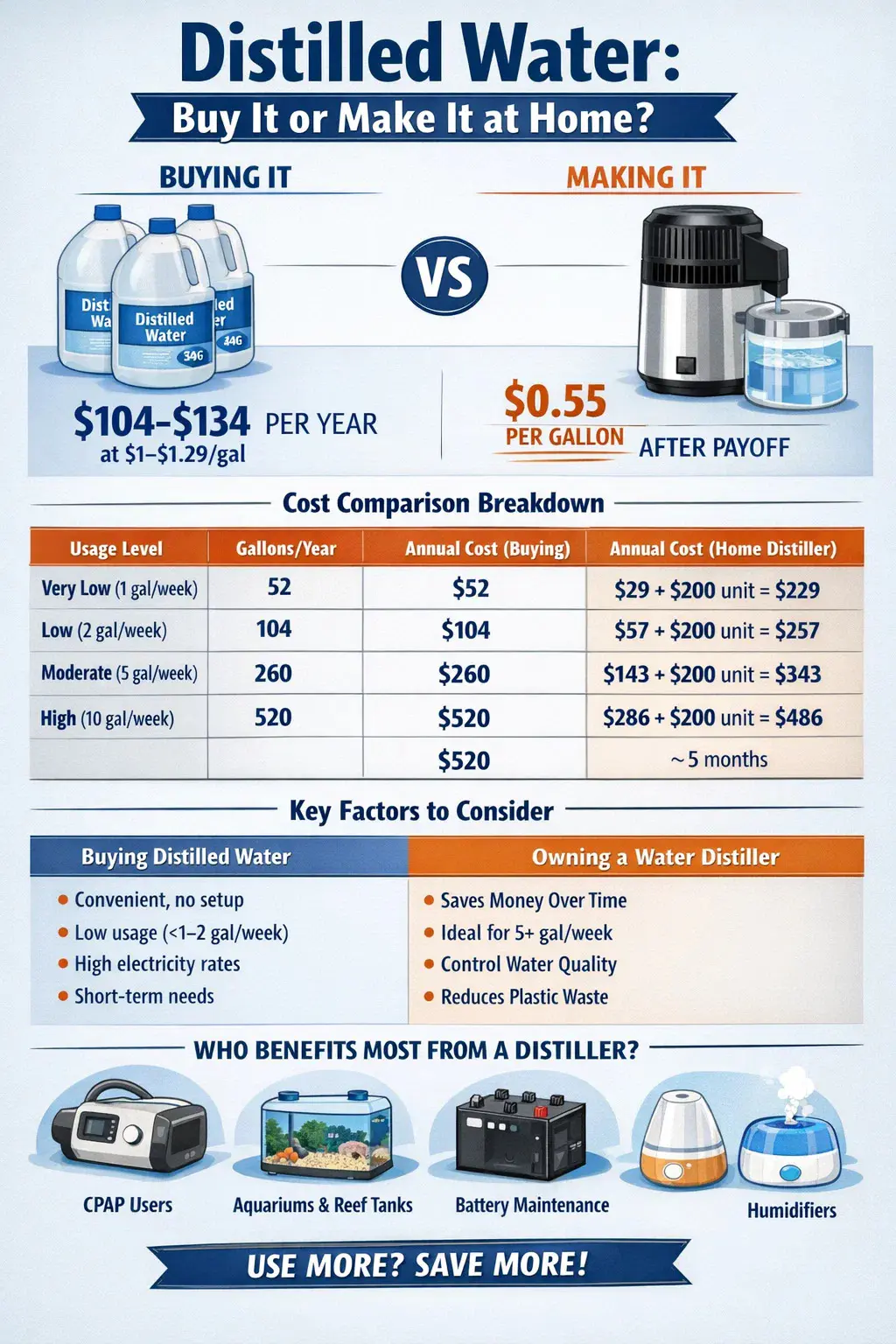 A felhasználás is gyorsan skálázódik. A CPAP gépek átlagosan körülbelül 1 gallont használnak fel hetente. Egy télen át tartó párásító hetente további 1-2 gallont fogyaszthat. A rendszeres feltöltést igénylő sósvízi akvárium heti 3-5 gallont igényelhet. A napelemes elrendezésben vagy a tartalék energiabankban lévő savas ólom akkumulátorokhoz rendszeres desztillált víz szükséges. Ha összerakja ezeket a felhasználásokat, a heti 5–10 gallon nem szokatlan, így az éves bolti költségek 260–520 dollárra vagy még többre emelkednek.