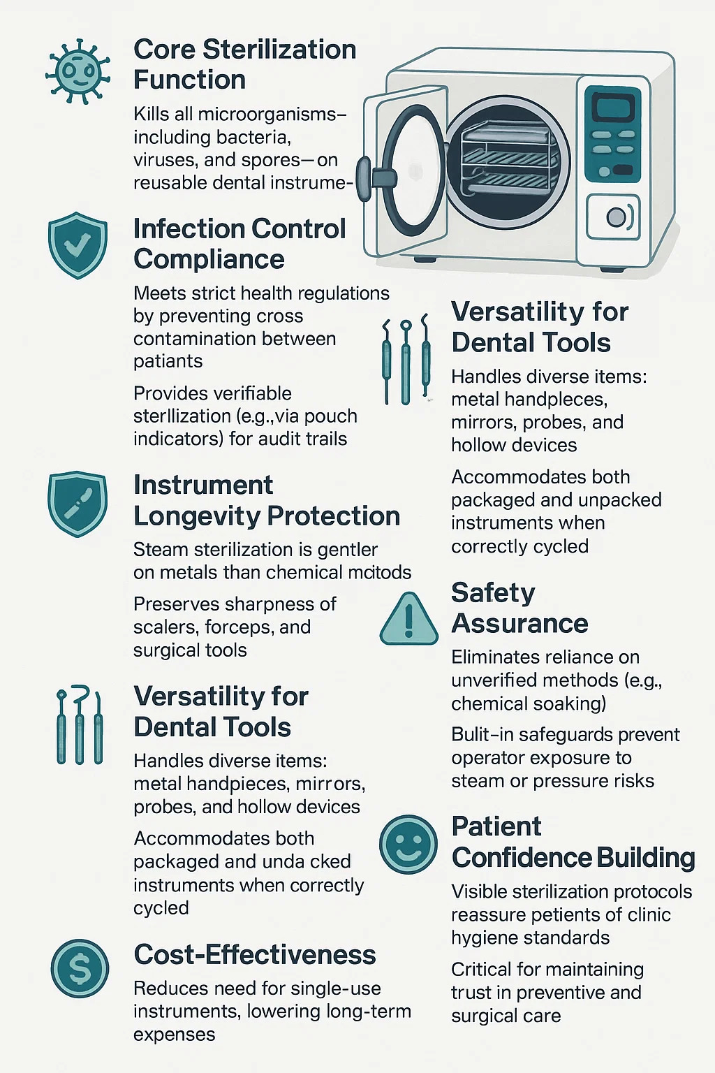 | Sterilizálja a műszereket | Elpusztítja az összes baktériumot, vírust és spórát | Biztosítja, hogy az eszközök biológiailag biztonságosak legyenek az újrafelhasználáshoz |