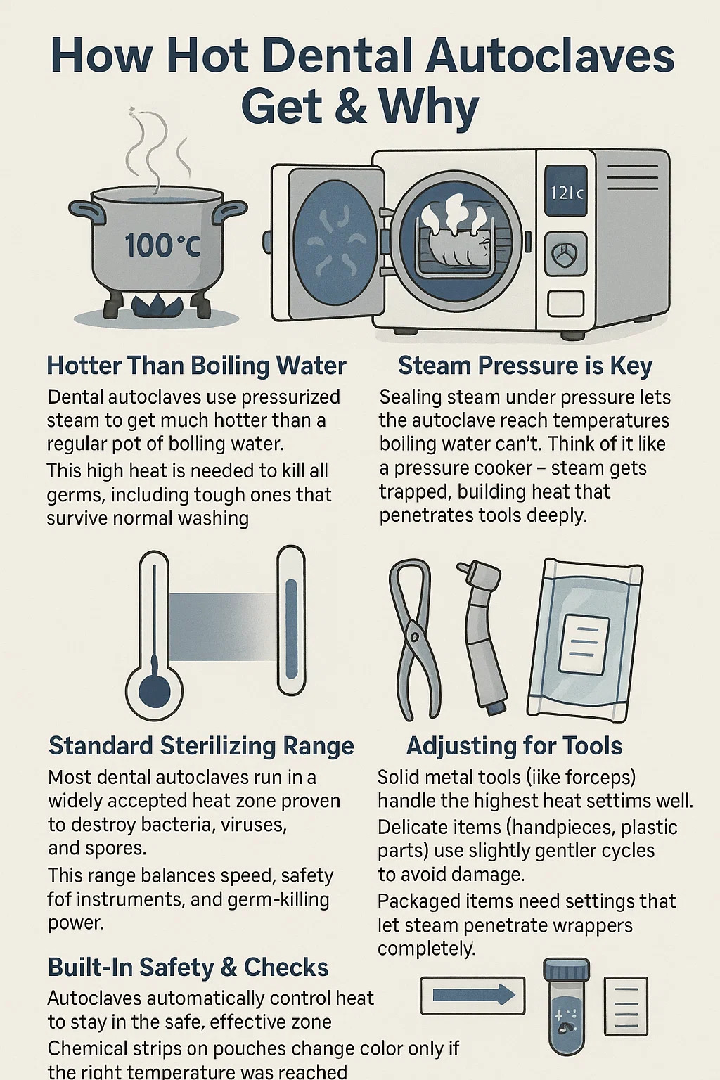 A legtöbb fogászati autoklávok széles körben elfogadott hőzónában fut, amely bizonyítottan elpusztítja a baktériumokat, vírusokat és spórákat.