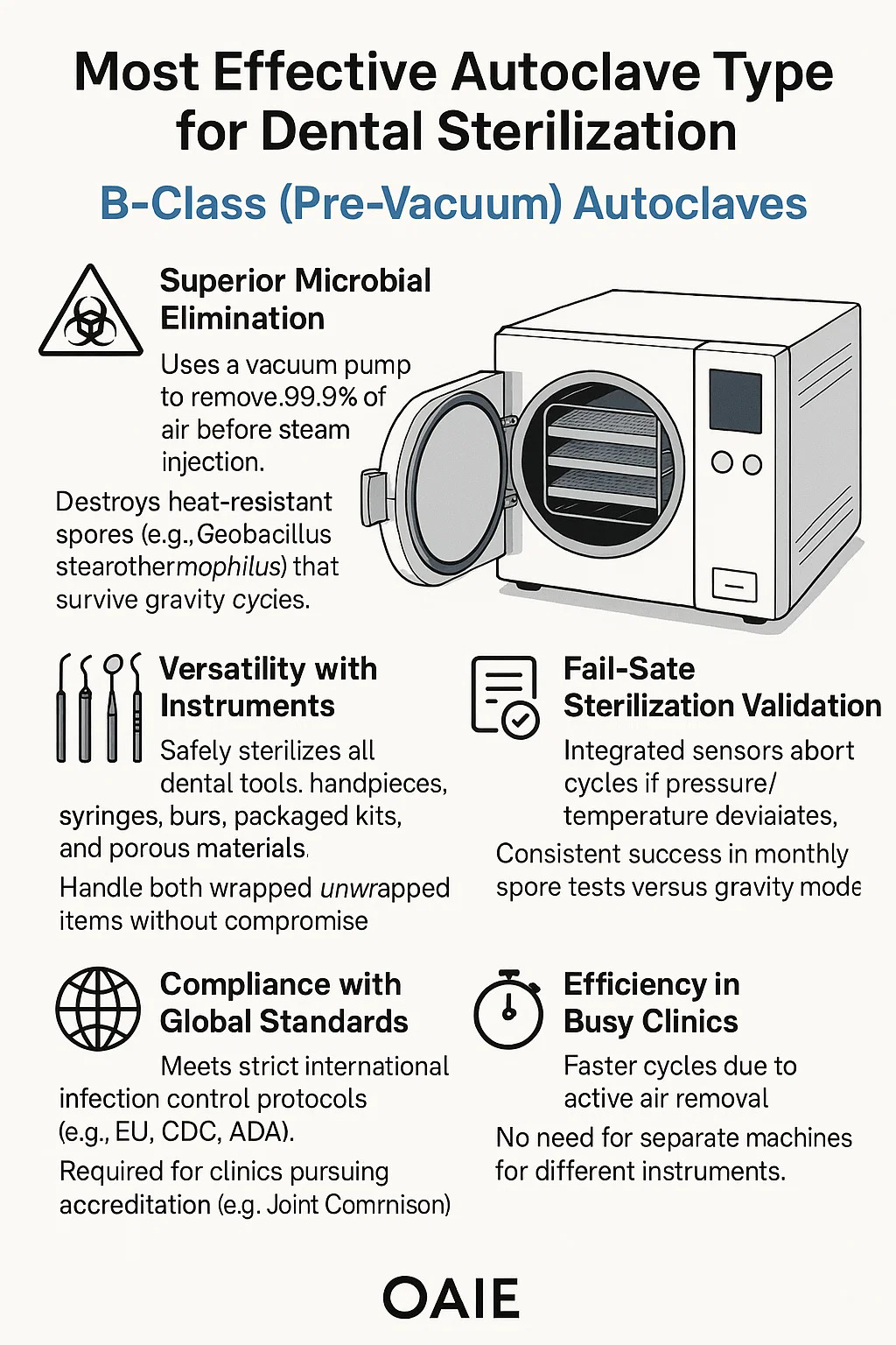Biztonságosan sterilizál minden fogászati eszközt: kézidarabokat, fecskendőket, fúrókat, csomagolt készleteket és porózus anyagokat.